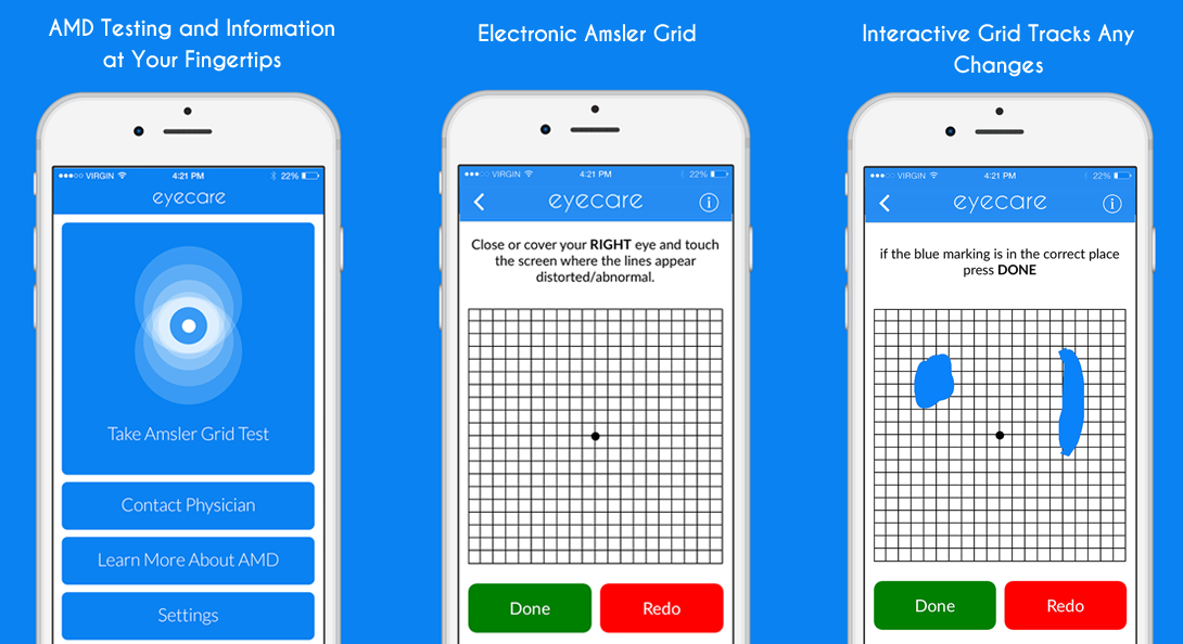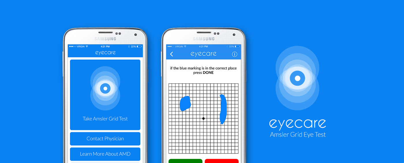 View here actual screenshots from the application. These images depict how you can keep track of any changes that may be occurring with your vision. Take control of your eye sight with the Eyecare interactive Amsler grid.
